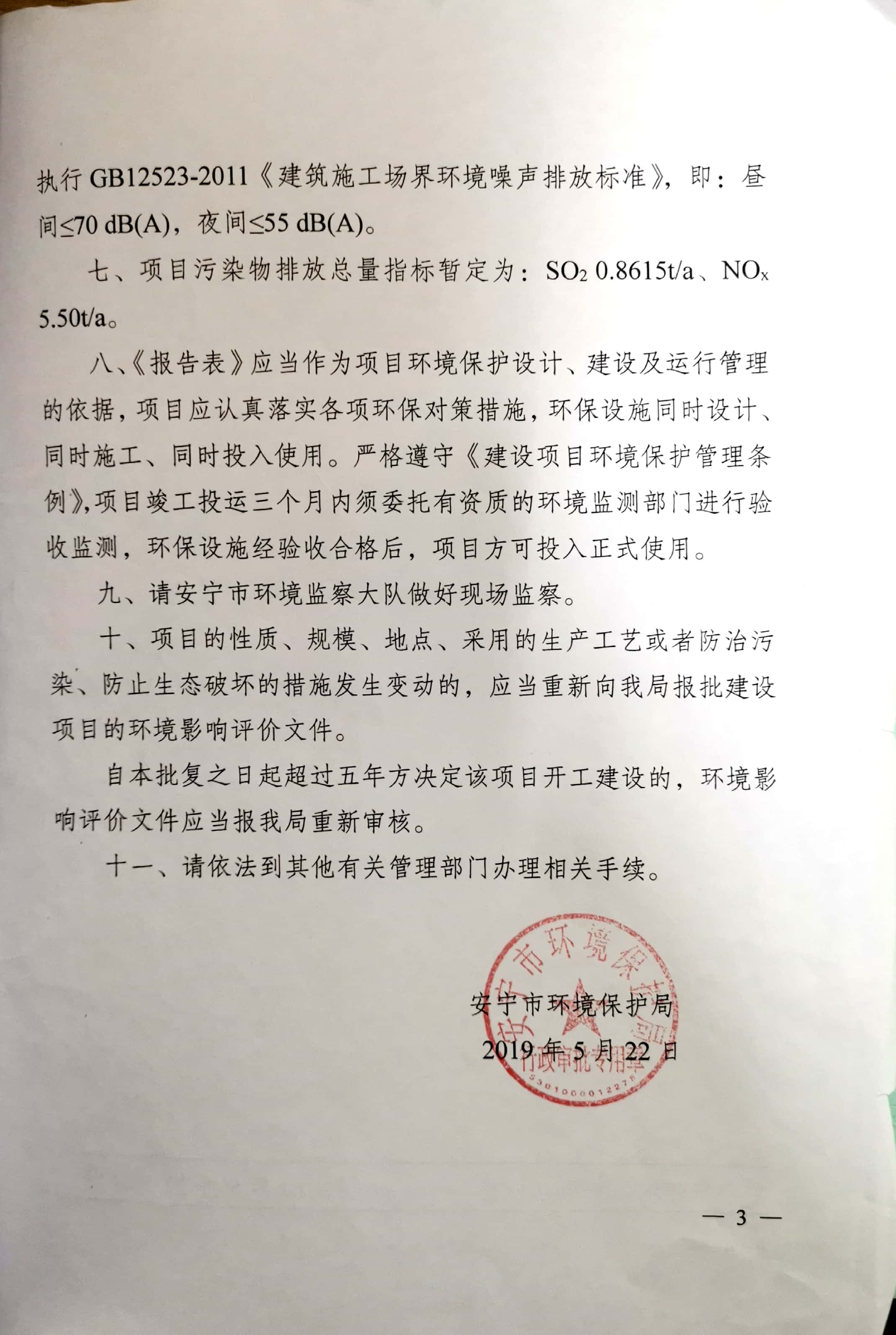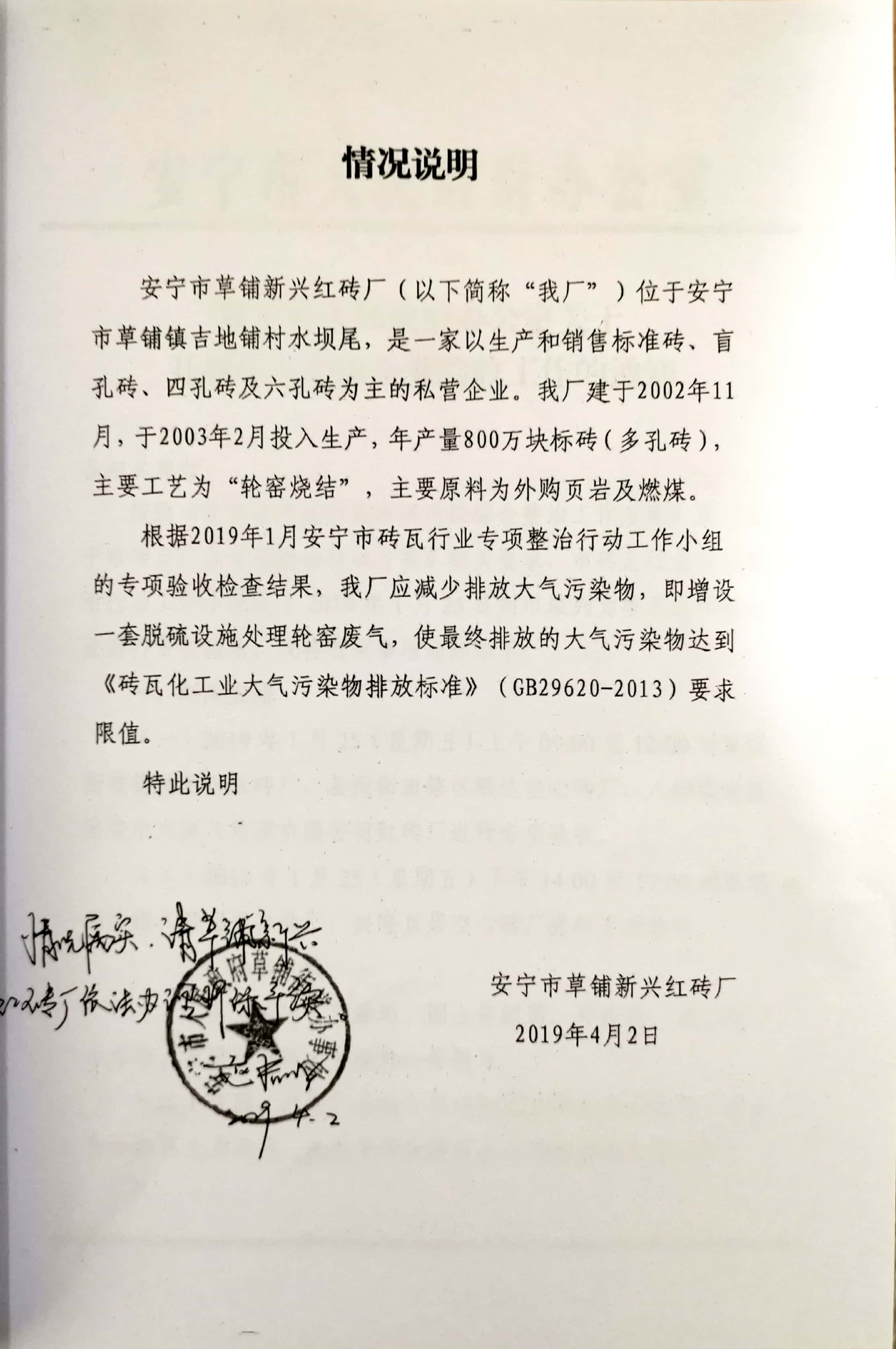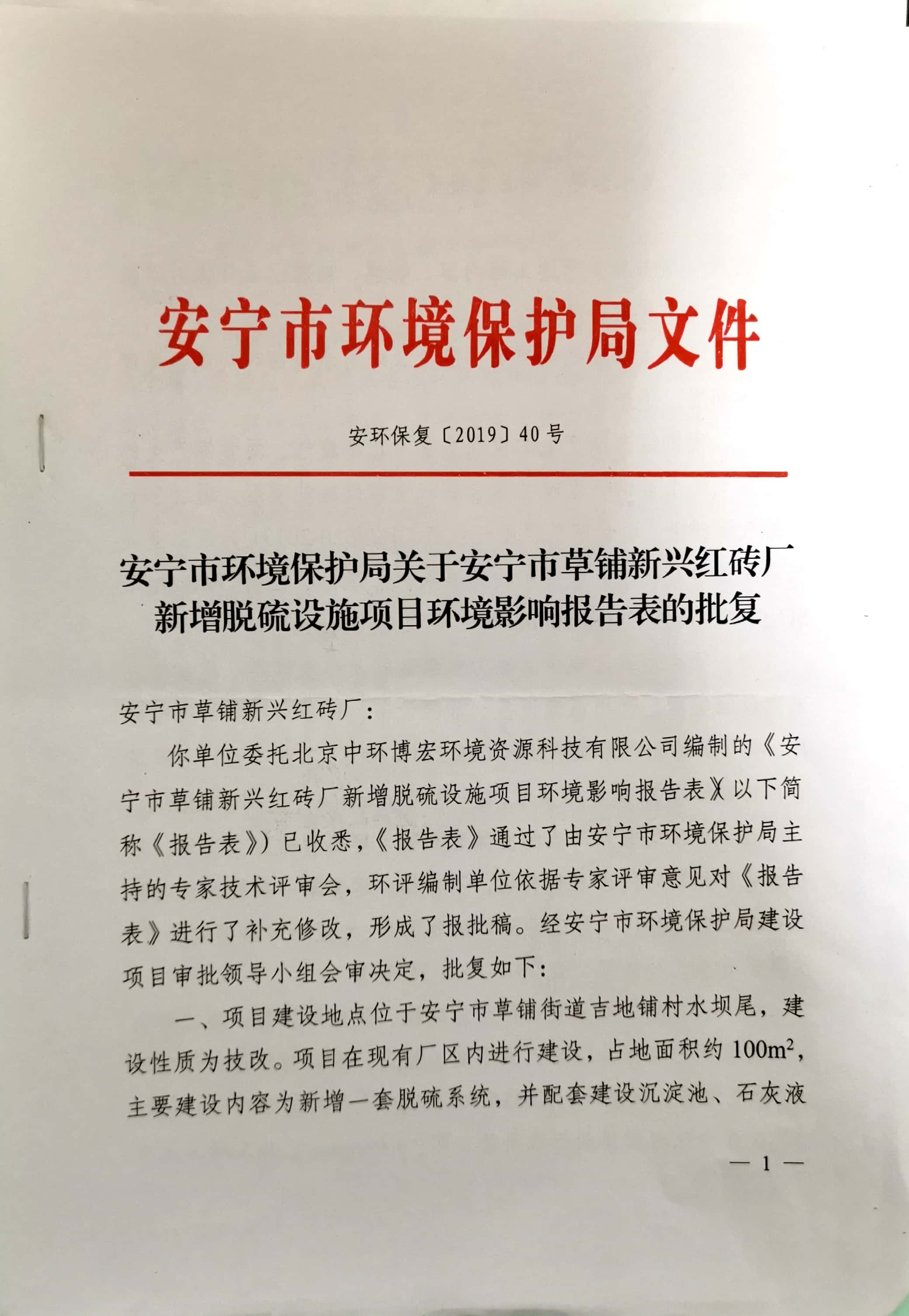 項(xiang)目建設(she)過程環(huan)(huan)保審(shen)批情(qing)況:2019年4月,北京(jing)中環(huan)(huan)博(bo)宏(hong)環(huan)(huan)境(jing)資源科技(ji)有限公司編制完成《安(an)寧市草(cao)鋪(pu)新(xin)(xin)興(xing)紅磚廠(chang)新(xin)(xin)增脫硫(liu)設(she)施(shi)項(xiang)目環(huan)(huan)境(jing)影(ying)(ying)響報告表》;2019年5月22日,該(gai)項(xiang)目獲得安(an)寧市環(huan)(huan)境(jing)保護局“關于《安(an)寧市草(cao)鋪(pu)新(xin)(xin)興(xing)紅磚廠(chang)新(xin)(xin)增脫硫(liu)設(she)施(shi)項(xiang)目環(huan)(huan)境(jing)影(ying)(ying)響報告表》的(de)批復(fu)”安(an)環(huan)(huan)保復(fu)【2019】40號。